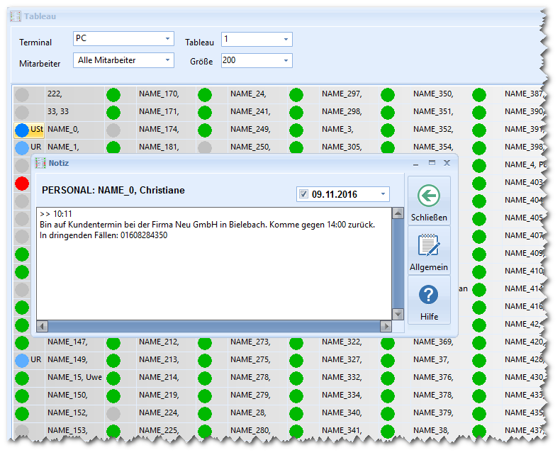 Option Tableau: Echzeit Anzeige über anwesende Mitarbeiter. Bei Abwesenheit kann ein Information hinterlegt werden.